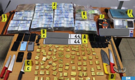 After searching in three homes in the city, the police seized a total of 87 small gold ingots, with a total weight of 33.13 kilograms, as well as significant sums of money in both dirhams and euros, suspected to be proceeds from this criminal activity.